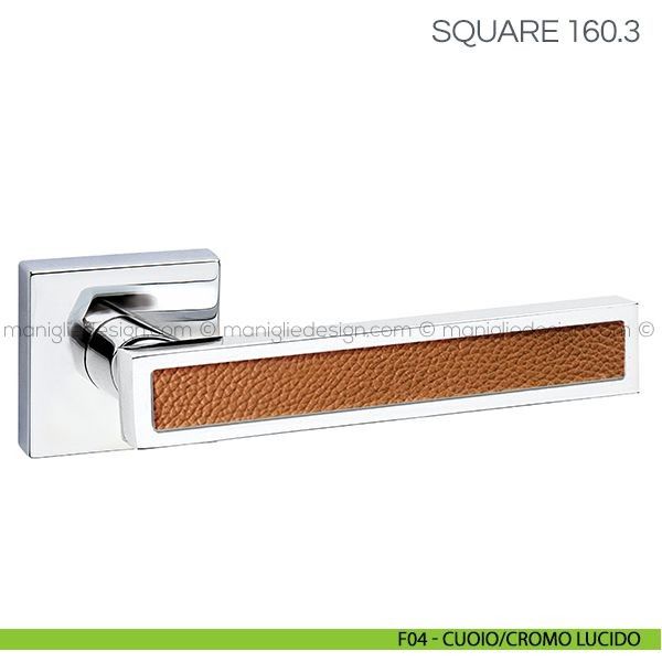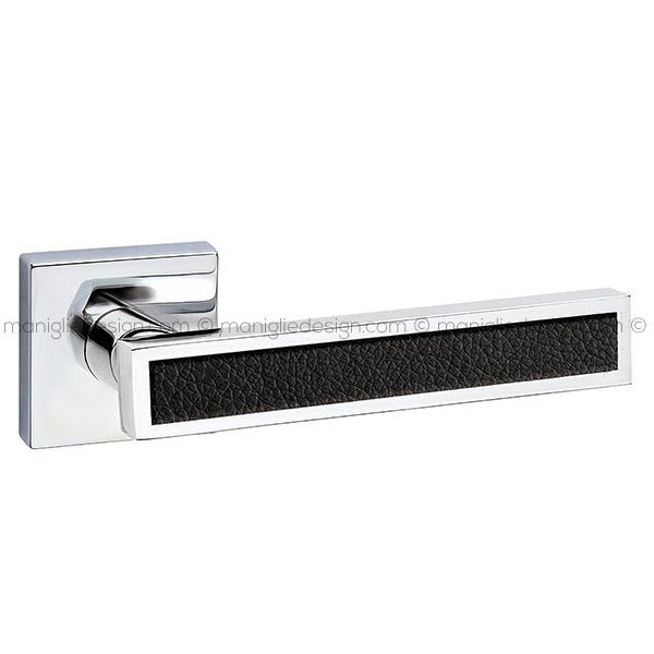 Maniglia con inserto in pelle per porta Square Fimet Handles su rosetta quadrata.