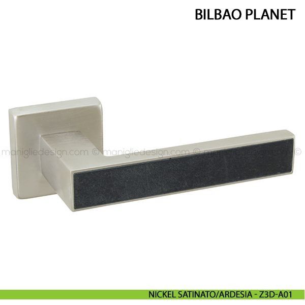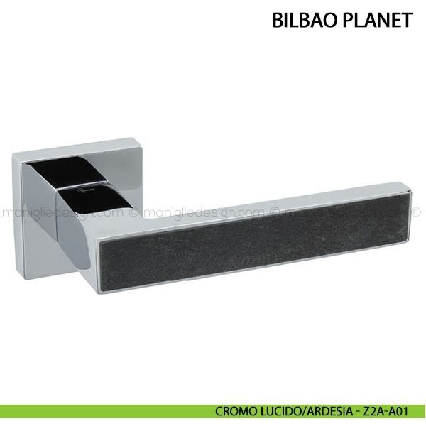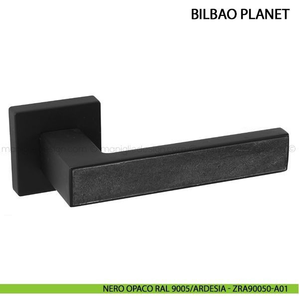 Maniglia con inserto in pietra per porta Bilbao Planet Comit con rosetta e bocchetta quadrata.