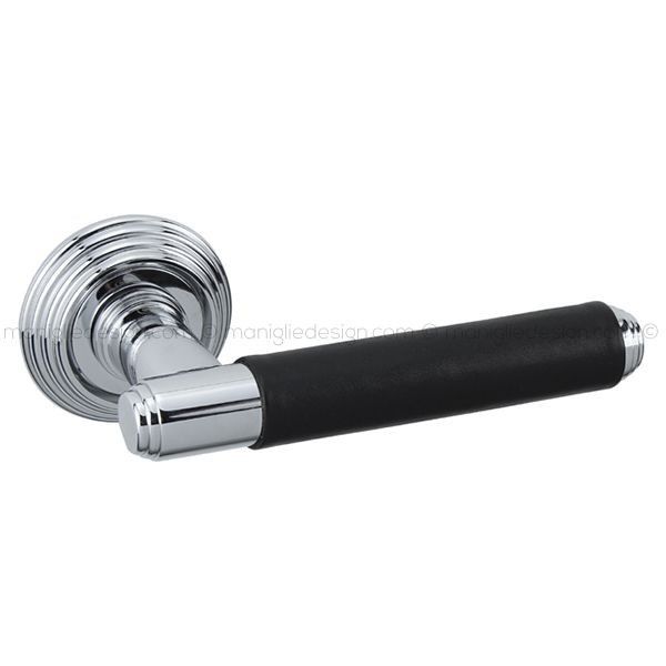 Maniglia in pelle per porta Exa Tailor Handmade Comit con rosetta e bocchetta tonda.