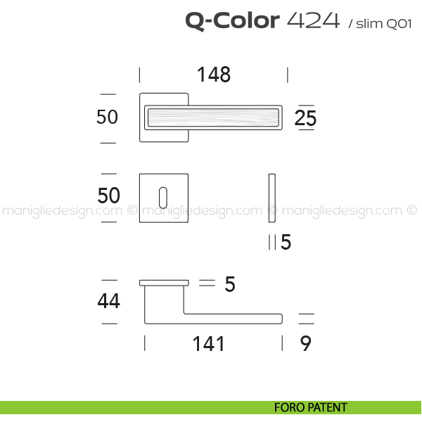 Lo studio di progettazione interno all'azienda Reguitti progetta una nuova serie di maniglie per interni chiamata 424 Q-Color Reguitti. Sicura nella presa, leggera nei volumi, raffinata nell'abbinamento tra inserti in ABS di colore diverso, Q-Color rappresenta un piacevole connubio fra robustezza e creatività. Capace di inserirsi con carattere e personalità sulle superfici di porte dal design moderno abbinando la cromaticità dell'inserto al colore della porta.