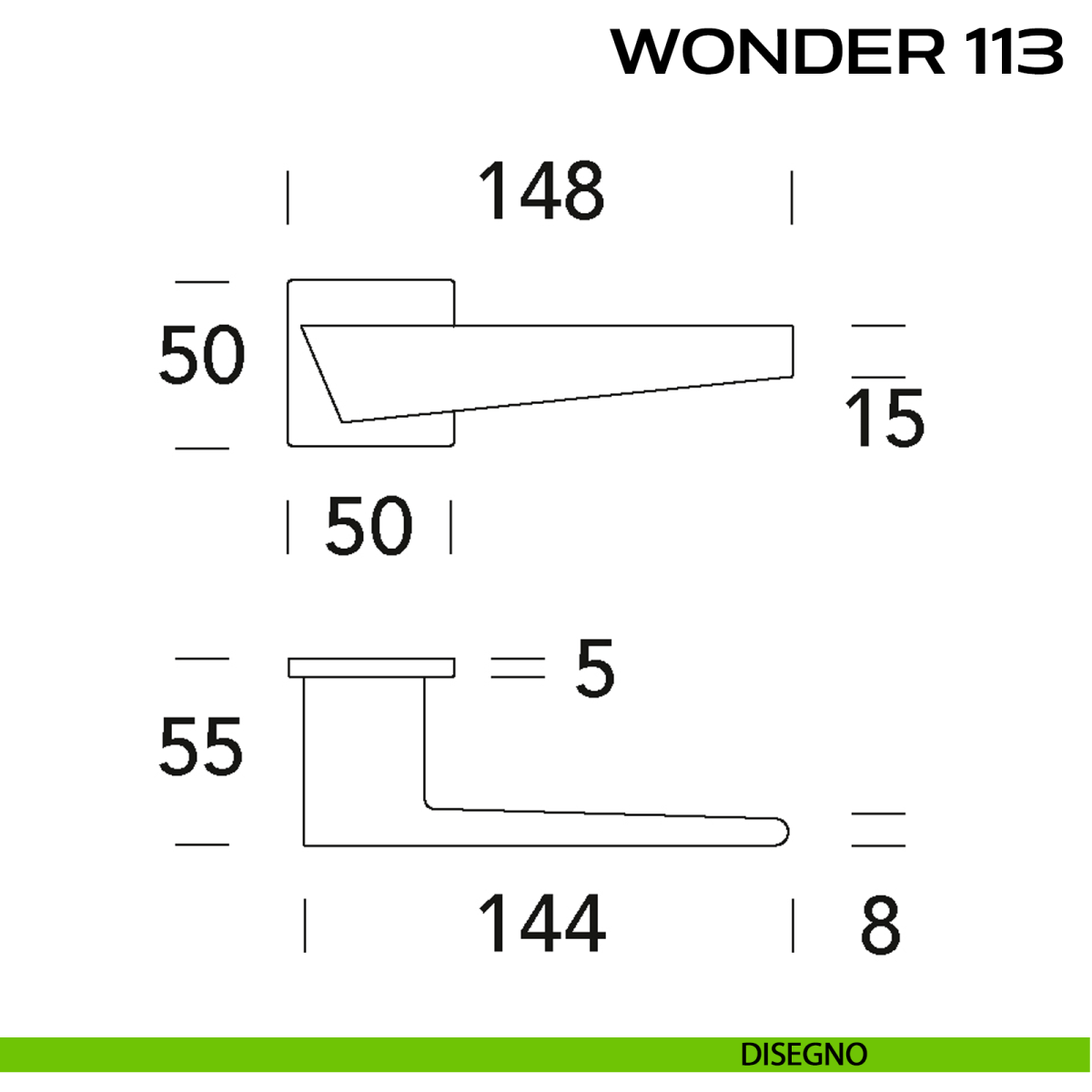 Maniglia per porta interna Wonder 113 Reguitti con rosetta quadrata. Design by Sergio Baronchelli.