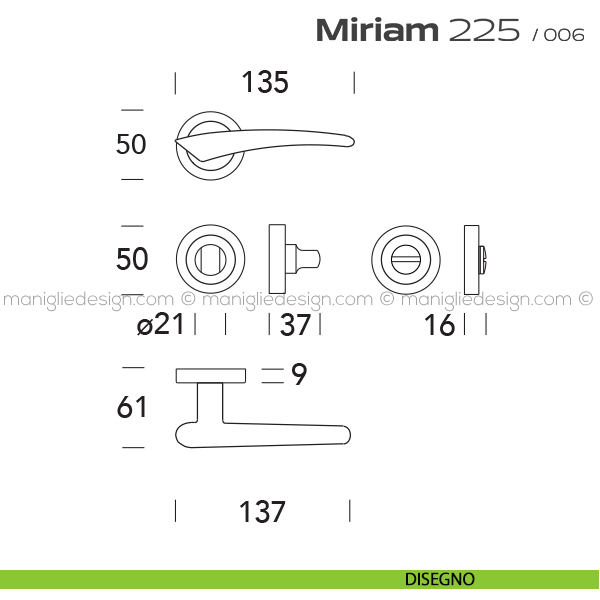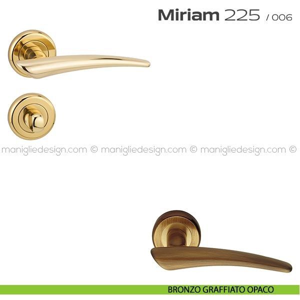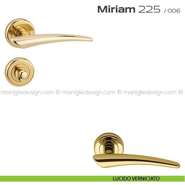 Lo studio di progettazione interno all'azienda Reguitti disegna una nuova serie di maniglie per interni chiamata 225 Miriam Reguitti, un prodotto dalla linea moderna e decisa, un deciso e dinamico gioco formale, per esaltare al meglio gli ambienti più classici e sofisticati. Miriam rappresenta il piacevole contrasto fra il gusto di oggi e il romantico fascino del mondo antico.