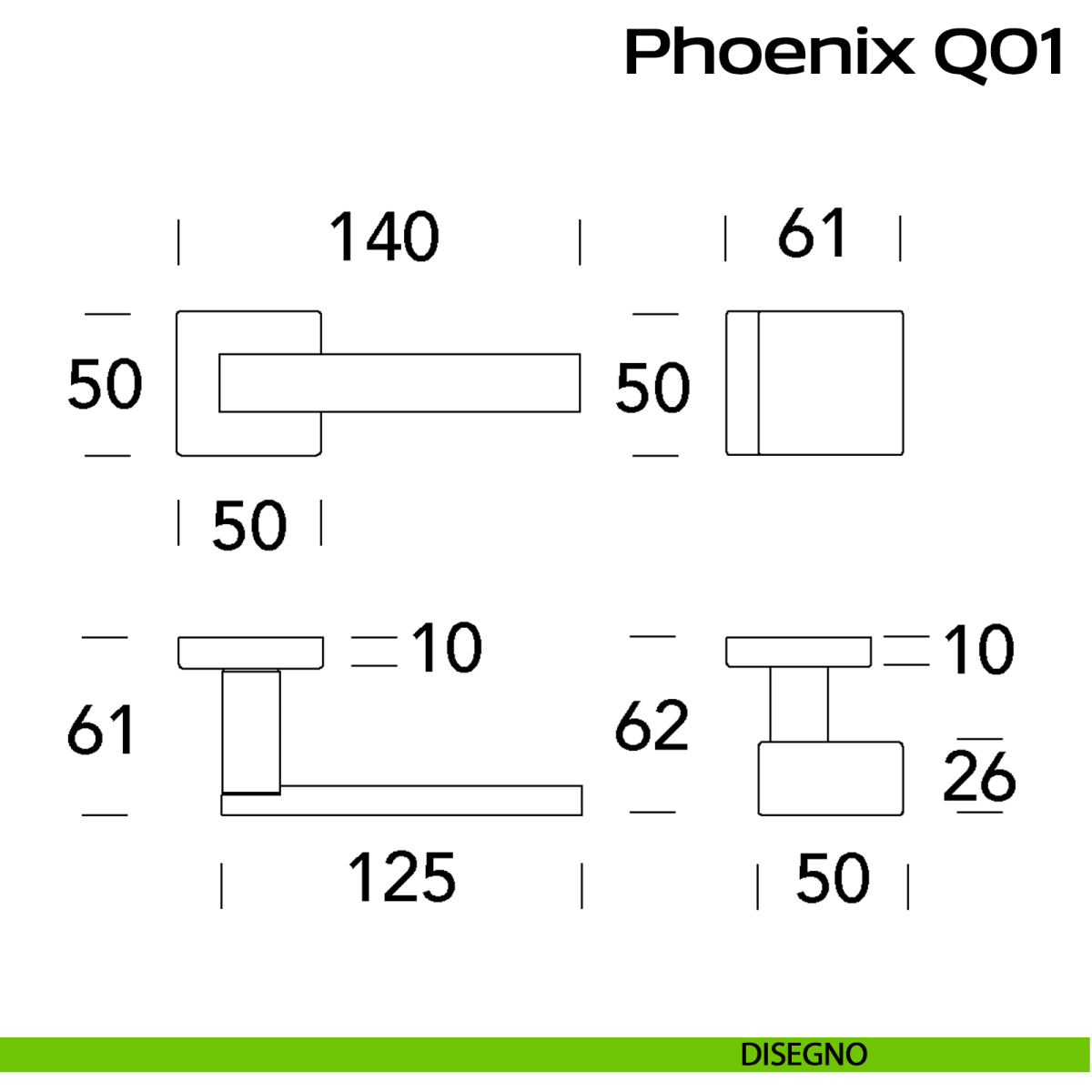 Maniglia in acciaio per porta Phoenix Q01 e pomolo fisso 2Q1 Reguitti Inox con rosetta quadrata. Design by Studio Reguitti Inox.