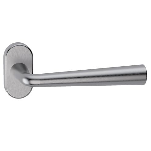 Maniglia in acciaio per porta Mikonos L29 Reguitti Inox con rosetta ovale. Design by Studio Reguitti Inox.