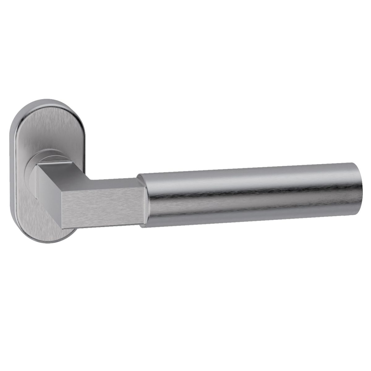 Maniglia in acciaio per porta Ottawa L19 Reguitti Inox con rosetta ovale. Design by Studio Reguitti Inox.