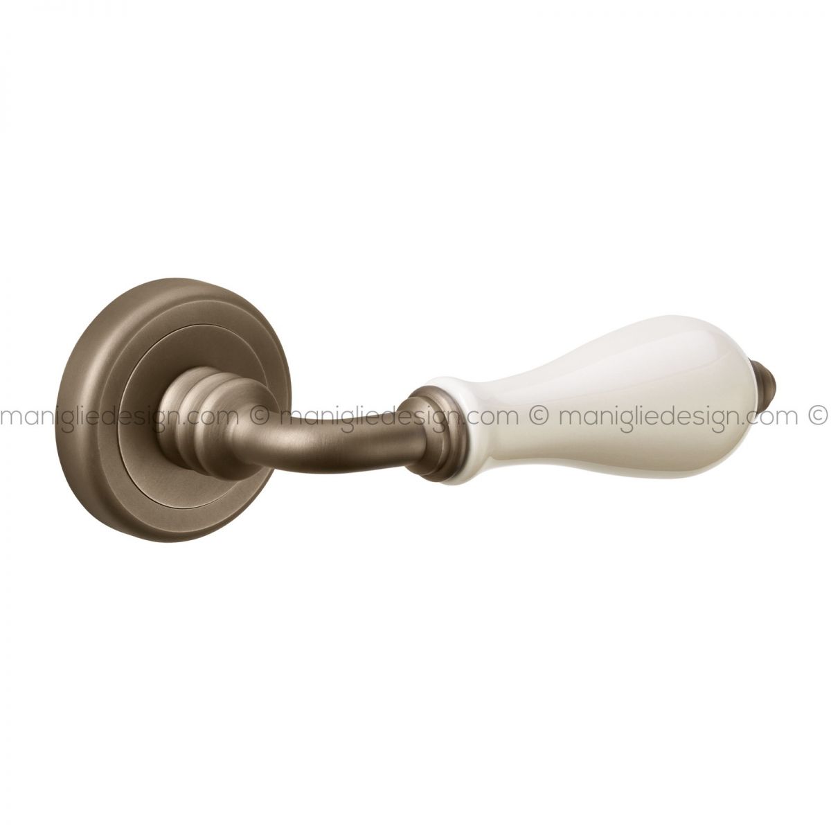 Maniglia con porcellana beige scuro per porta interna Marta Poggi Mariani con rosetta e bocchetta tonda.