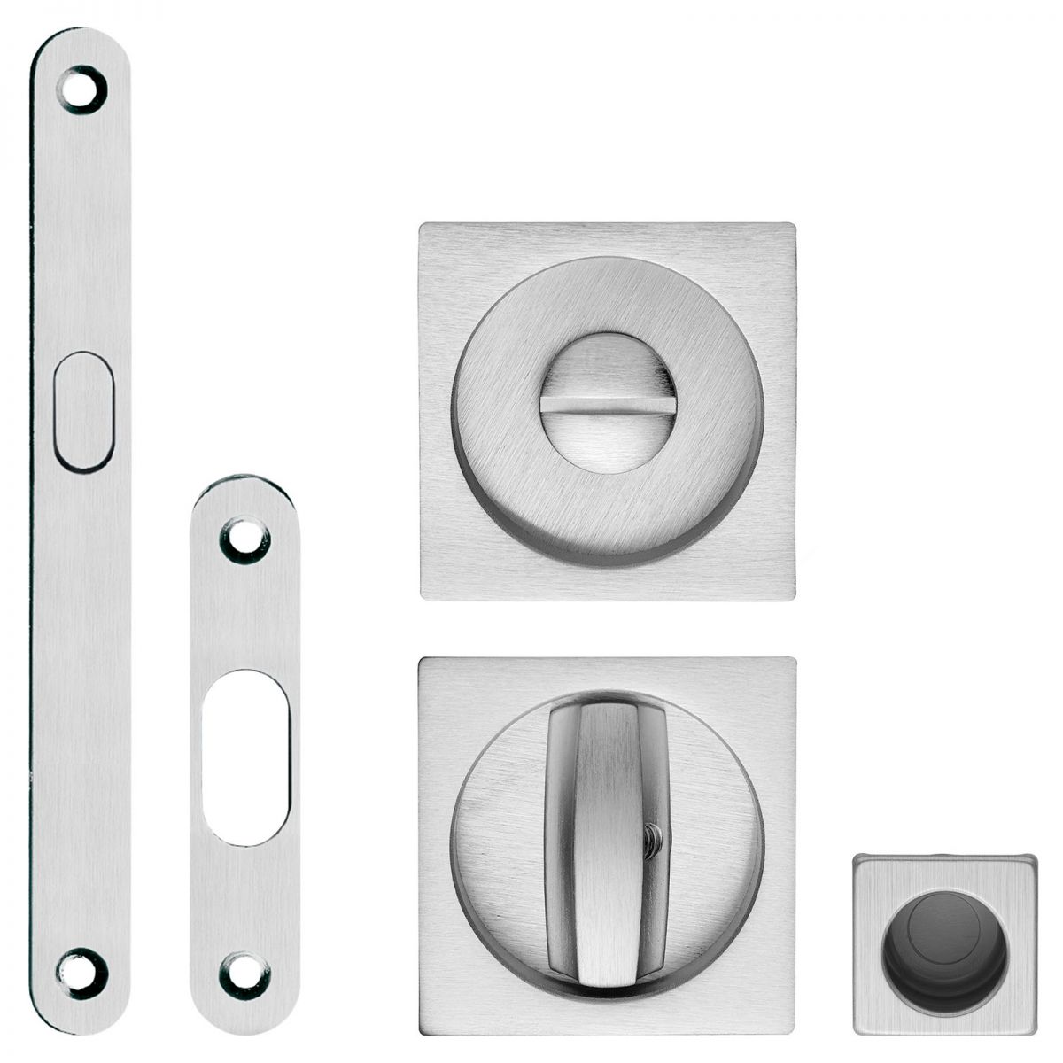 Kit maniglia incasso quadrata con nottolino, taglio vite, maniglia di trascinamento e serratura per porta scorrevole Zincral Linea Calì.