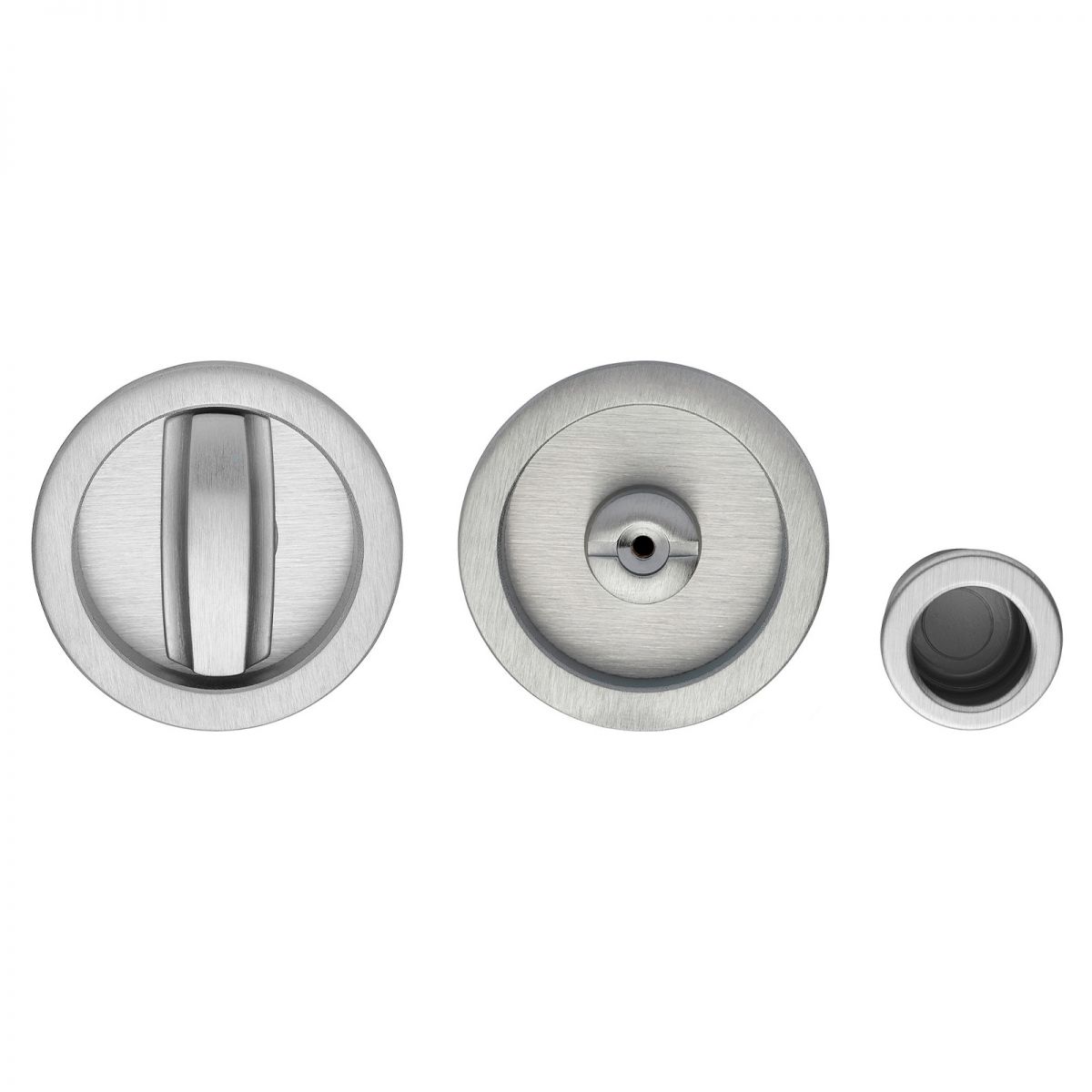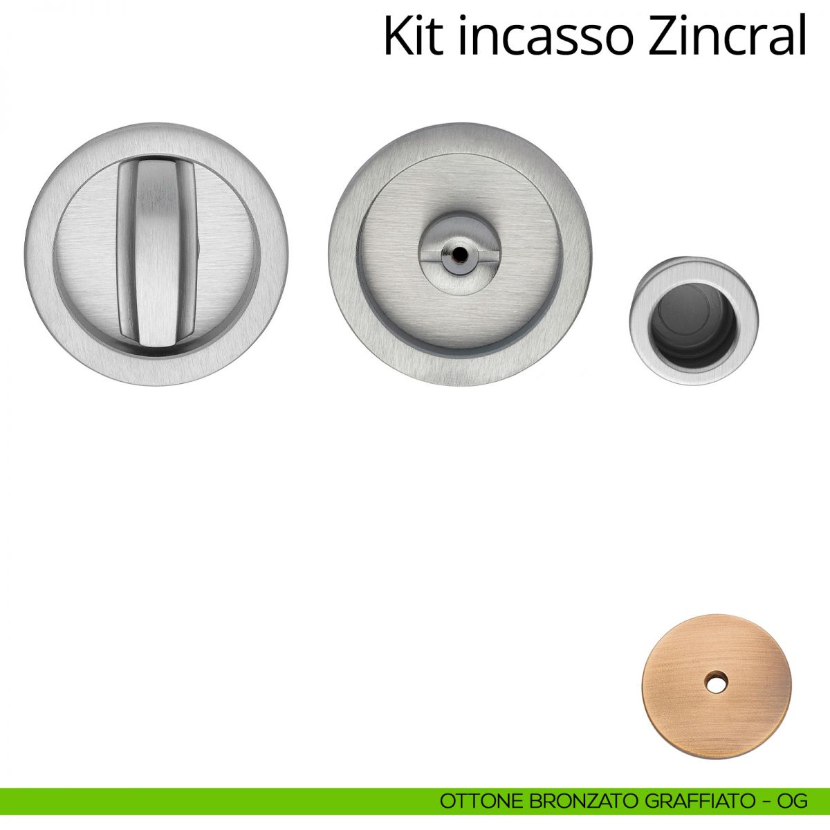 Kit maniglia incasso tonda con nottolino, taglio vite e maniglia di trascinamento per porta scorrevole Zincral Linea Calì.