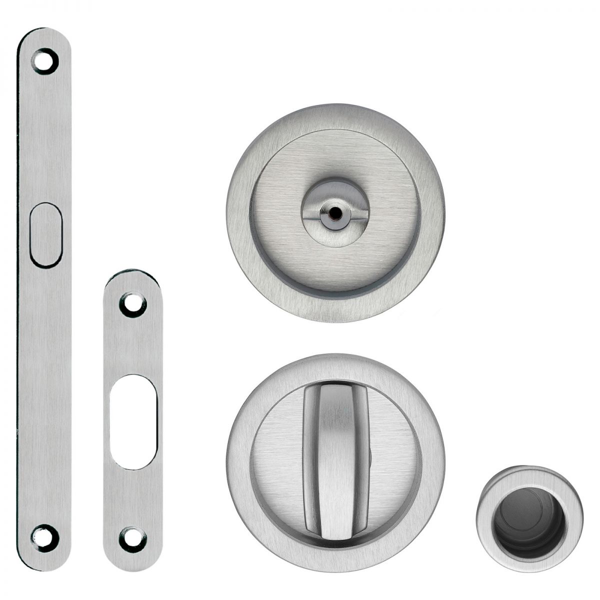 Kit maniglia incasso tonda con nottolino, taglio vite, maniglia di trascinamento e serratura per porta scorrevole Zincral Linea Calì.