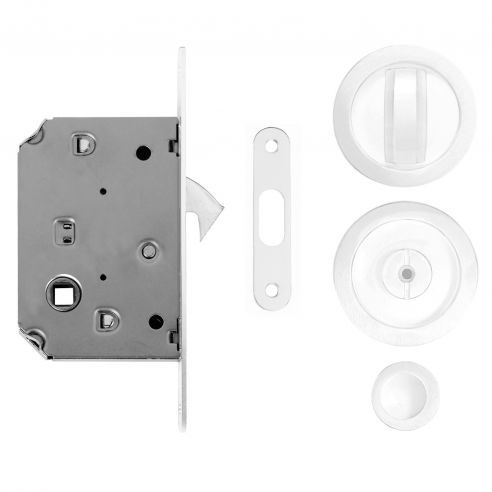 Maniglia per porta scorrevole tonda con nottolino, taglio vite, ditale di trascinamento e serratura bianco opaco.