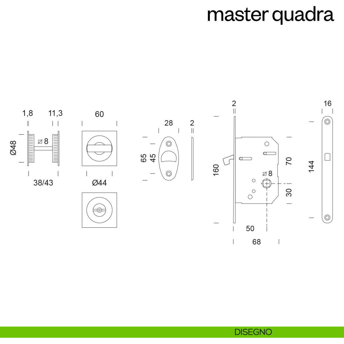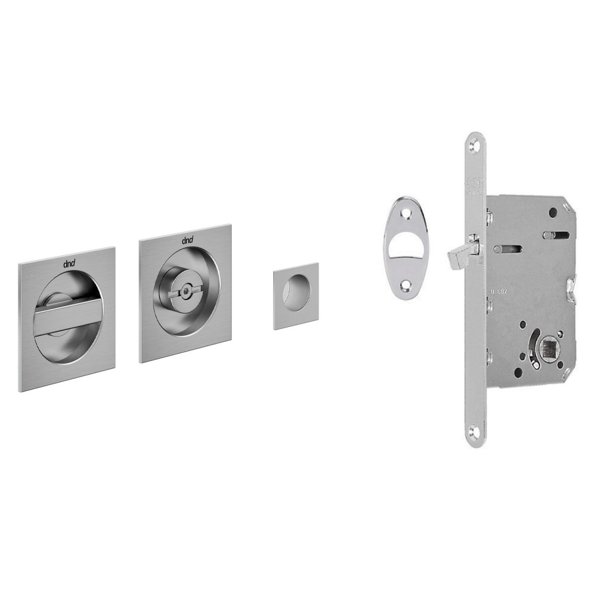Maniglia per porta scorrevole con nottolino, taglio vite, ditale di trascinamento e serratura Master Quadra dnd handles. Design by Dnd Technical Division.