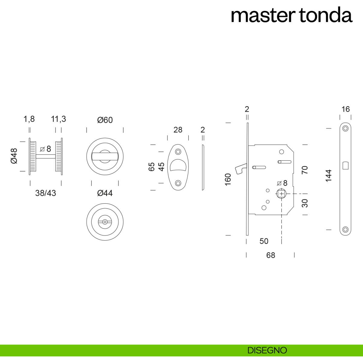 Maniglia per porta scorrevole con nottolino, taglio vite, ditale di trascinamento e serratura Master Tonda dnd handles. Design by Dnd Technical Division.
