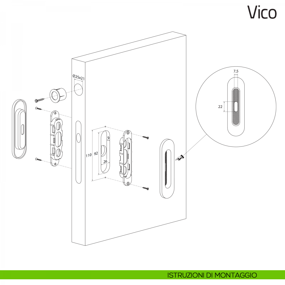 Maniglia ad incasso per porta scorrevole Vico Olivari senza foro chiave.