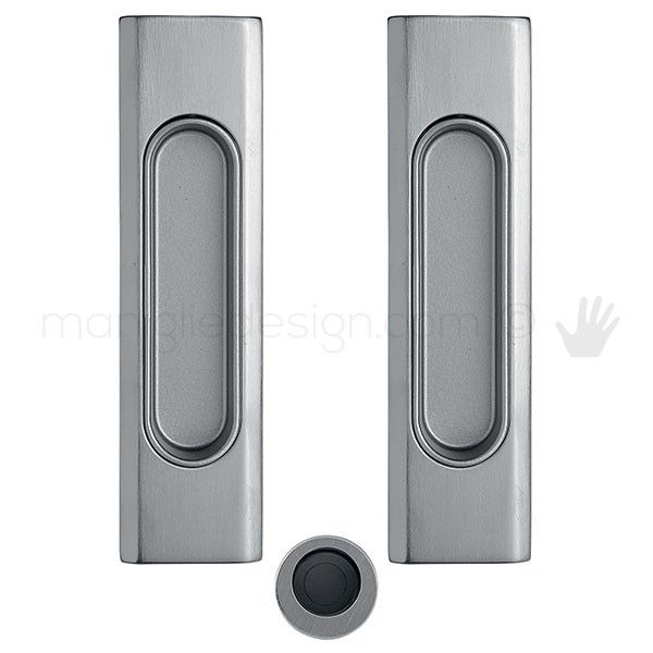 Maniglia per porta scorrevole Clip Mandelli senza serratura composto da due maniglie da incasso e maniglietta di trascinamento.