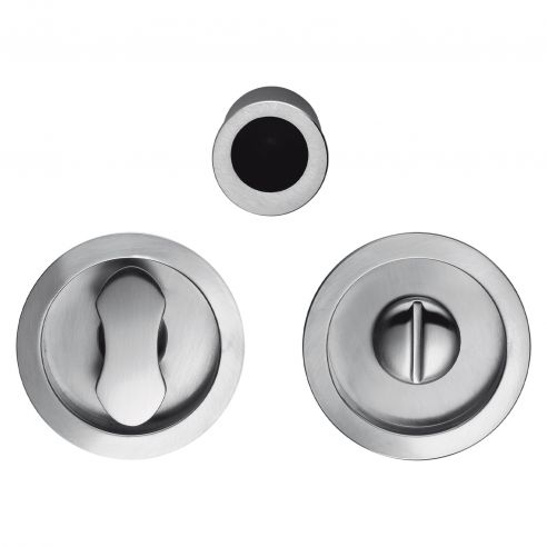 Maniglia per porta scorrevole Open Colombo Design con serratura composto da due maniglie ad incasso con dispositivo chiusura nottolino, maniglietta di trascinamento e serratura (E 50 mm) a gancio dotata di contropiastra in acciaio inox.