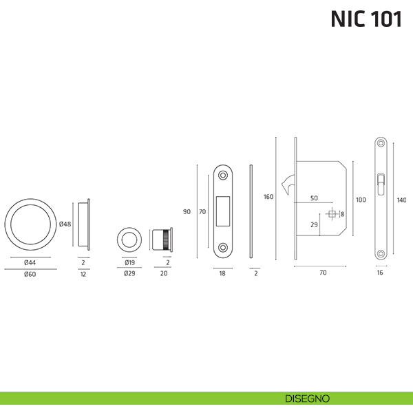 Kit tondo foro chiave con chiave, trascinatore e serratura per porta scorrevole NIC 101 Comit.