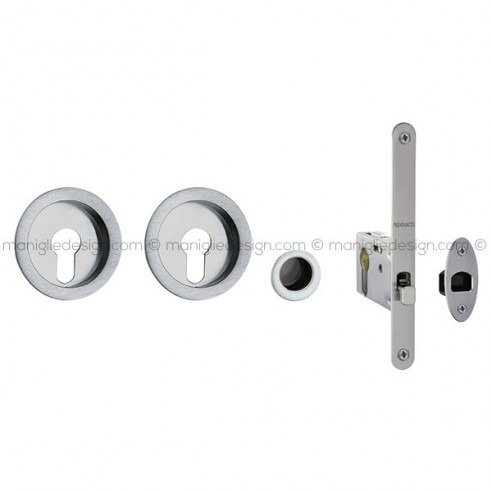 Kit placche incasso tonde con foro yale per porte scorrevoli 524 Reguitti con frontalino di trascinamento e serratura 028SR. Design by Studio Reguitti.