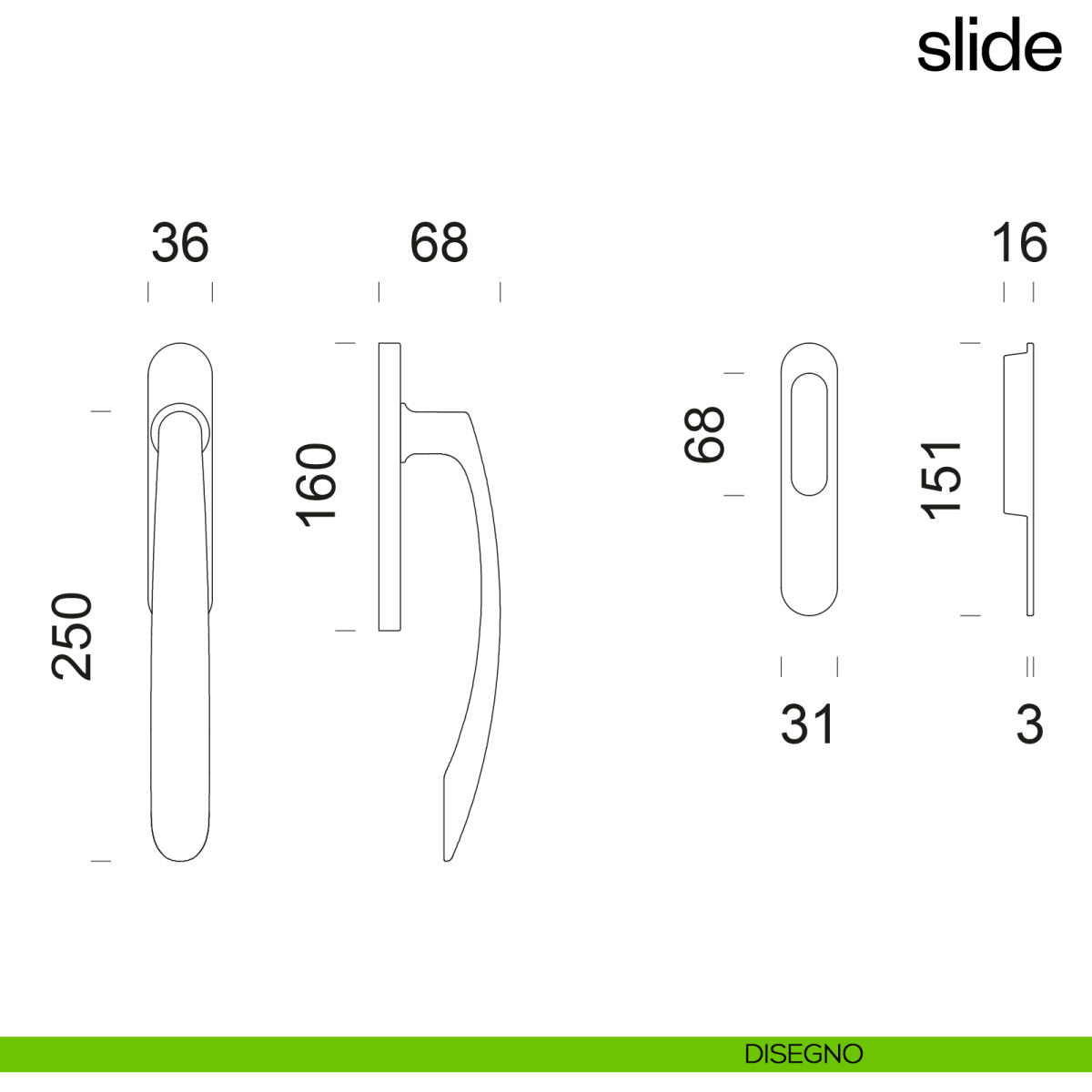 Maniglione per alzante scorrevole Slide dnd Handles singolo comprensivo di maniglia incasso. Design by Mauro Ronchi.