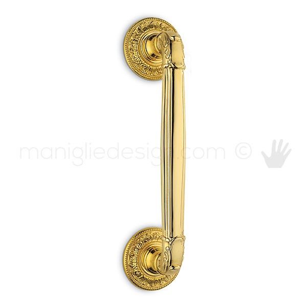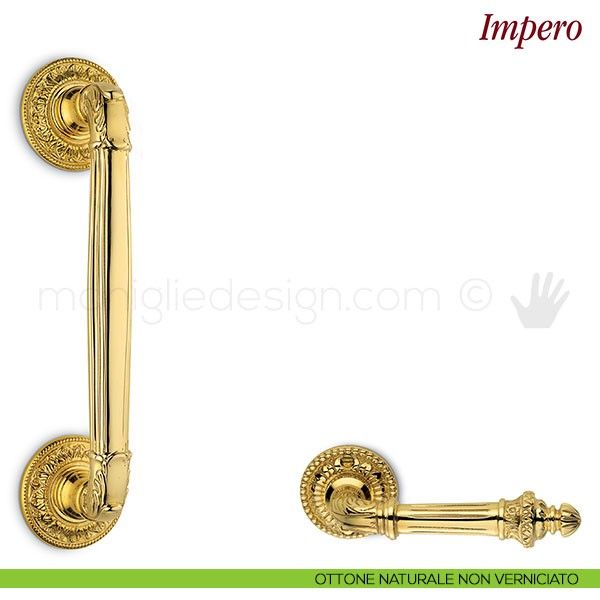 Maniglione per porta Impero Antologhia zancato completo di accessori per il fissaggio passante singolo con copridadi interni.