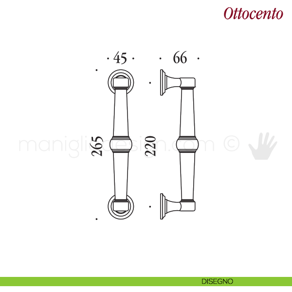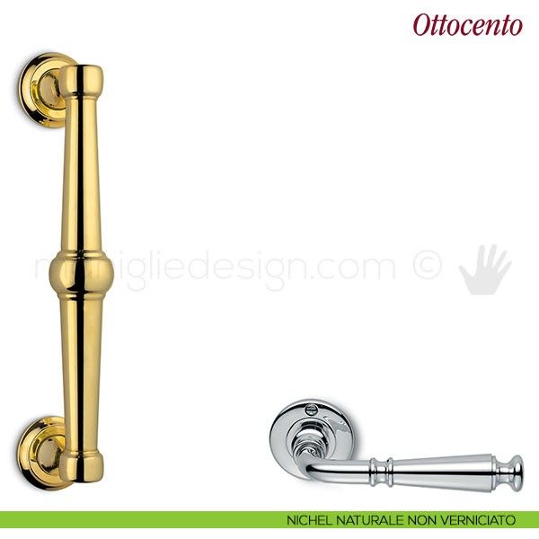 Maniglione per porta Ottocento Antologhia diritto completo di accessori per il fissaggio passante singolo con copridadi interni e per il fisaggio non passante.