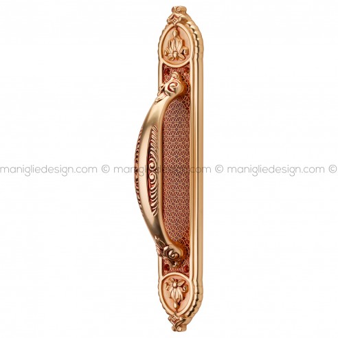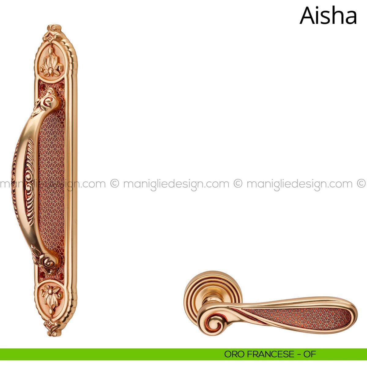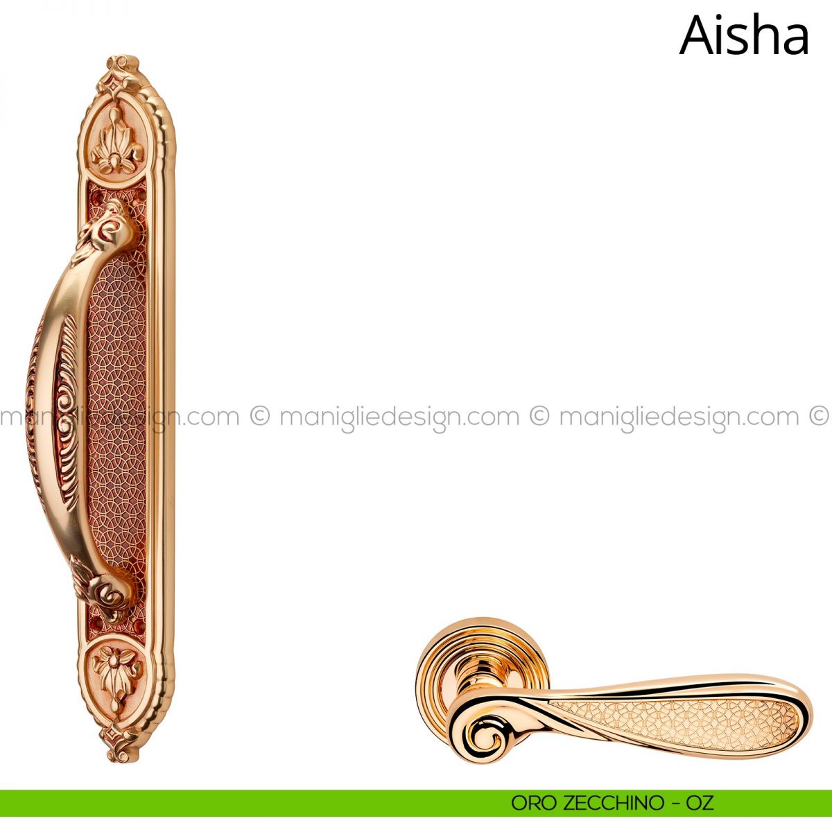 Aisha è la nuova maniglia in ottone firmata Linea Calì. Le geometrie dell’architettura araba rifioriscono in questa collezione di maniglie per porte classica ed elegante. Un attento studio delle proporzioni ha dato vita a un particolare design che si sviluppa dal collo della maniglia come un fiore che si schiude, e un grande petalo a formare l’impugnatura vera e propria. Questa, ricca di finezze come le nervature che le donano un’inaspettata tridimensionalità, è caratterizzata da un originale motivo a rilievo. Ispirato alle geometrie architettoniche di Alhambra (Spagna), si estende armoniosamente grazie a un attento bilanciamento degli spazi, e crea un insolito effetto che inganna l’occhio impedendogli di isolare la singola forma originaria. La lavorazione manuale impressa ad alcune finiture mette in risalto questo motivo conferendogli un tipico sapore artigianale.