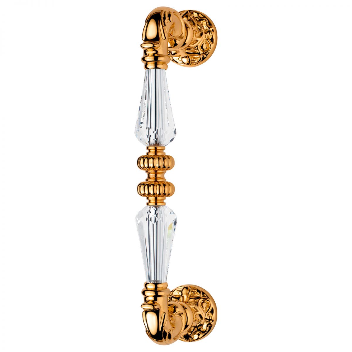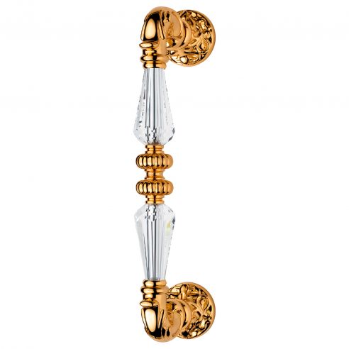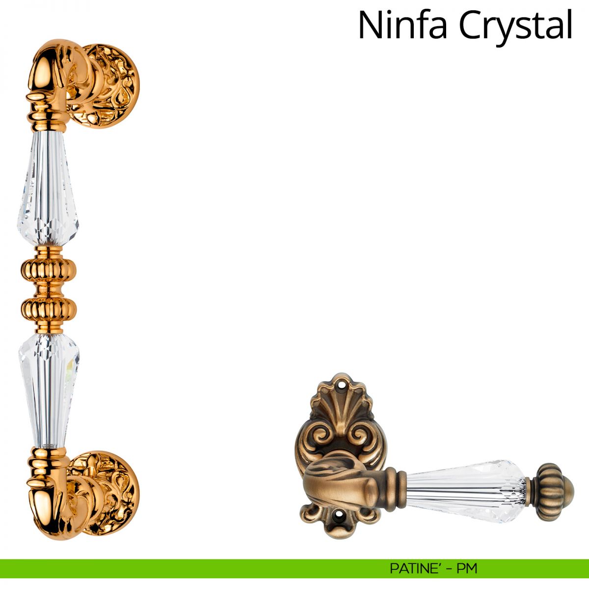 La collezione di maniglie per porte e finestre Ninfa Crystal riprende gli stilemi dello stile Barocco arricchendoli con preziosi inserti in cristallo Swarovski®. Particolarmente curata in ogni particolare, Ninfa Crystal si contraddistingue per l’impugnatura a clessidra realizzata interamente in cristallo Swarovski® e per i suo decori, che richiamano gli intarsi del mastro artigiano Domenico Cucci. Cucci, abilissimo cesellatore, fu uno dei massimi esponenti della tecnica dell’intarsio e realizzò anche il trono di Luigi XIV, interamente realizzato in argento. Degno di nota è anche l’elegantissimo pomolo, disponibile anche nella pregiata finitura oro zecchino, contraddistinto da raffinati intarsi e da un enorme cristallo Swarovski® che lo rende particolarmente prezioso. Il maniglione per porte e portoni d’ingresso, anch’esso realizzato in ottone e con l’impugnatura realizzata in cristallo Swarovski®, completa questa elegante collezione vintage.