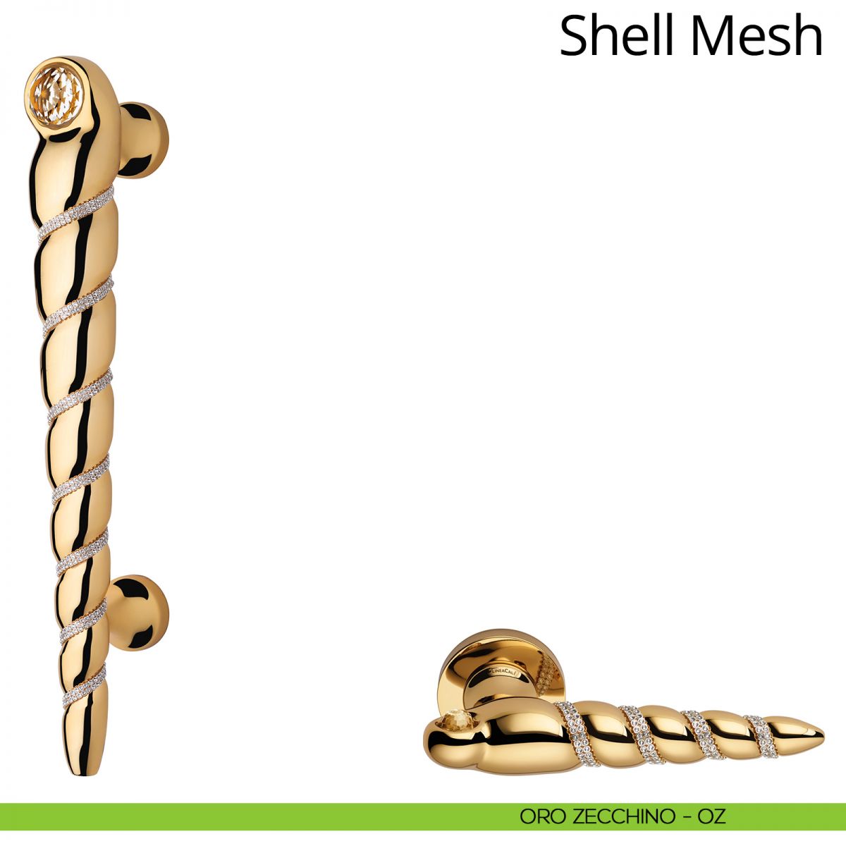 Dalla particolare forma con giri convessi, Shell Mesh è la nuovissima serie di maniglie Linea Calì che entra a far parte della linea Crystal. Un filo di originali cristalli Swarovski® ne esalta la forma, mentre un grosso cristallo incastonato (sempre in cristallo Swarovski®) ne riflette il colore completando l’effetto finale e rendendola simile a un gioiello appartenente ad un vecchio tesoro ritrovato su di un’isola deserta. Appartenente anch’essa alla “spring/summer collection 2013”, Shell Mesh è si è contraddistinta fin da subito anche per la particolarissima forma che ricorda la rarissima conchiglia del Golfo di Gabes (Tunisia), scoperta da De Folin nel 1869 e soprannominata “Ebala Gracillima”.