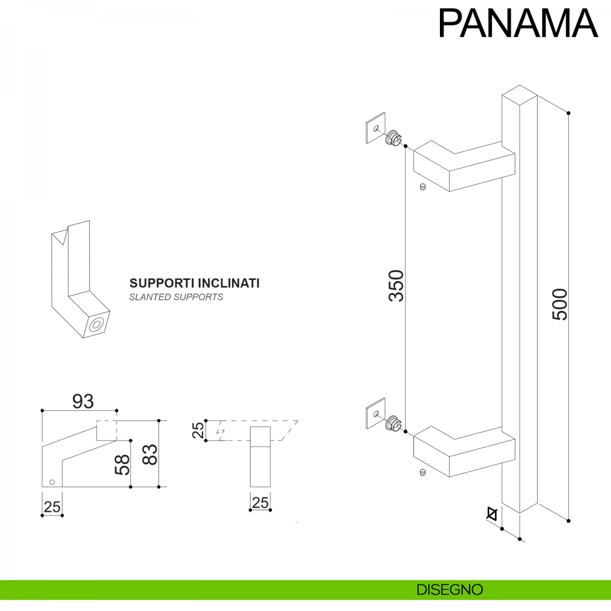 Maniglione in acciaio inclinato quadrato per porta 25x25 mm Panama Fimet Inox senza rosette comprensivo di kit per il fissaggio. Design by Fimet Inox Project.