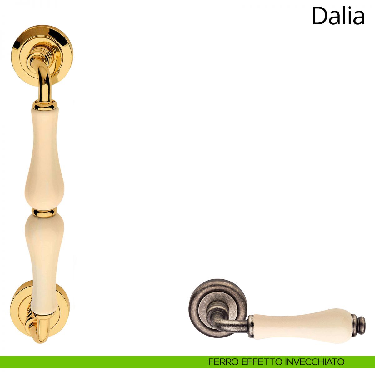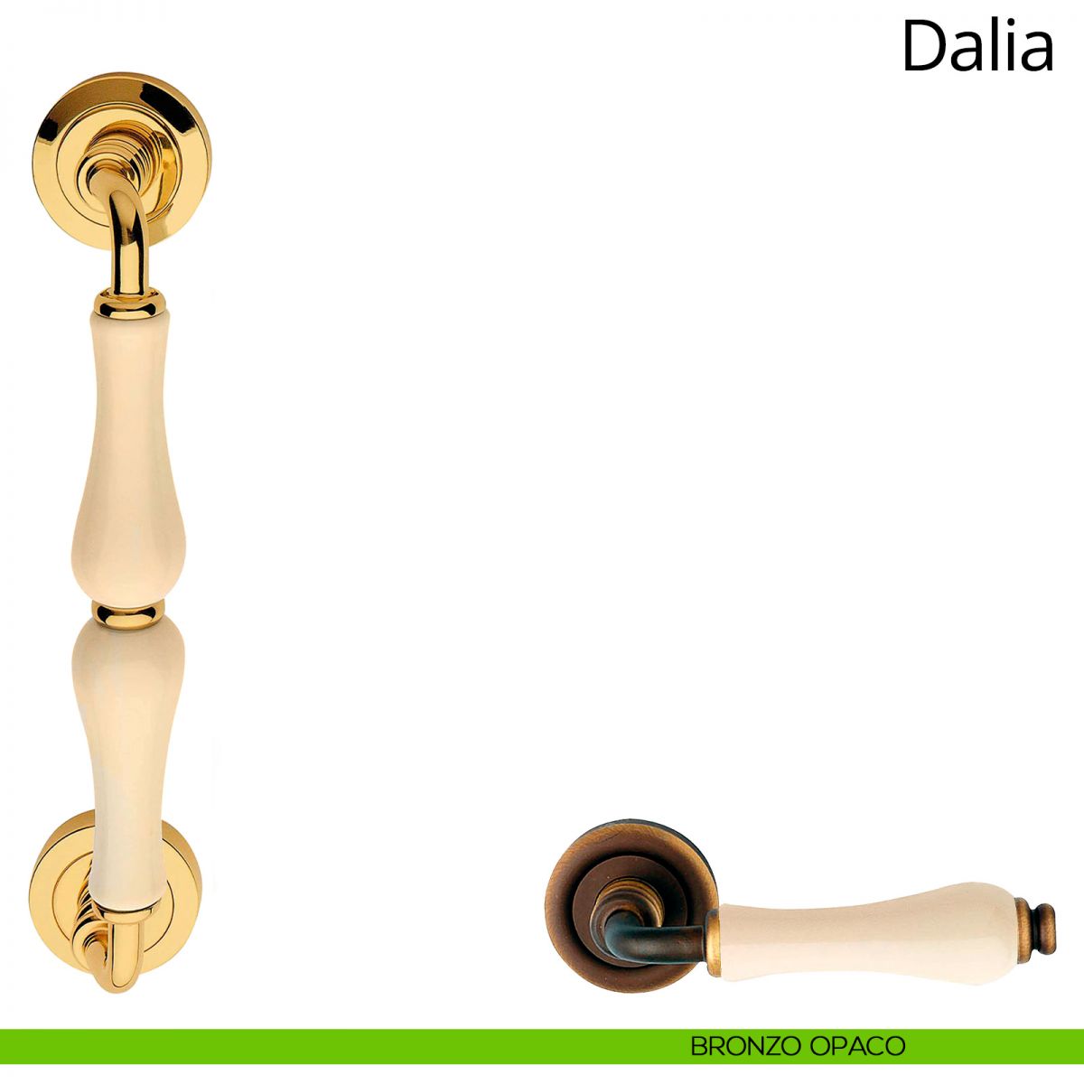 La collezione di maniglie Dalia è un classico della maniglieria italiana, un viaggio oltre il tempo e le mode. Progettata nel lontano 1990, da allora continua a mietere consensi per via delle sue forme morbide, piacevolmente classiche e femminili. La bocchetta minuta è stata ideata consapevolmente per accompagnarsi ai profili stretti dei serramenti in legno di un tempo, mentre la forme “a clessidra” dell’impugnatura accoglie la mano con un’inaspettata sensazione di morbidezza. Ed è proprio l’impugnatura a fare la differenza; le sue delicate proporzioni si bilanciano perfettamente con il gambo e la bocchetta in un susseguirsi di curve e rilievi, leit motiv di questa collezione di maniglie. La preziosa impugnatura in ceramica italiana della collezione Dalia è disponibile in numerose fantasie e colori, fra i quali spicca la porcellana beige (perfetta per tutti i serramenti di legno scuro, come l’iroko), fino all’ultima arrivata: l’insolita porcellana maculata. Degne di nota sono anche le numerose varianti floreali (fiore rosa, fiore marrone e fiore blu) decorate da sapienti mani artigiane. L’ampia gamma di modelli a catalogo consente a Dalia di adattarsi a tutte le tipologie di porte e finestre, mentre le 35 varianti disponibili le permettono di adattarsi a tutte le tipologie di ambienti, dal classico al country-chic.