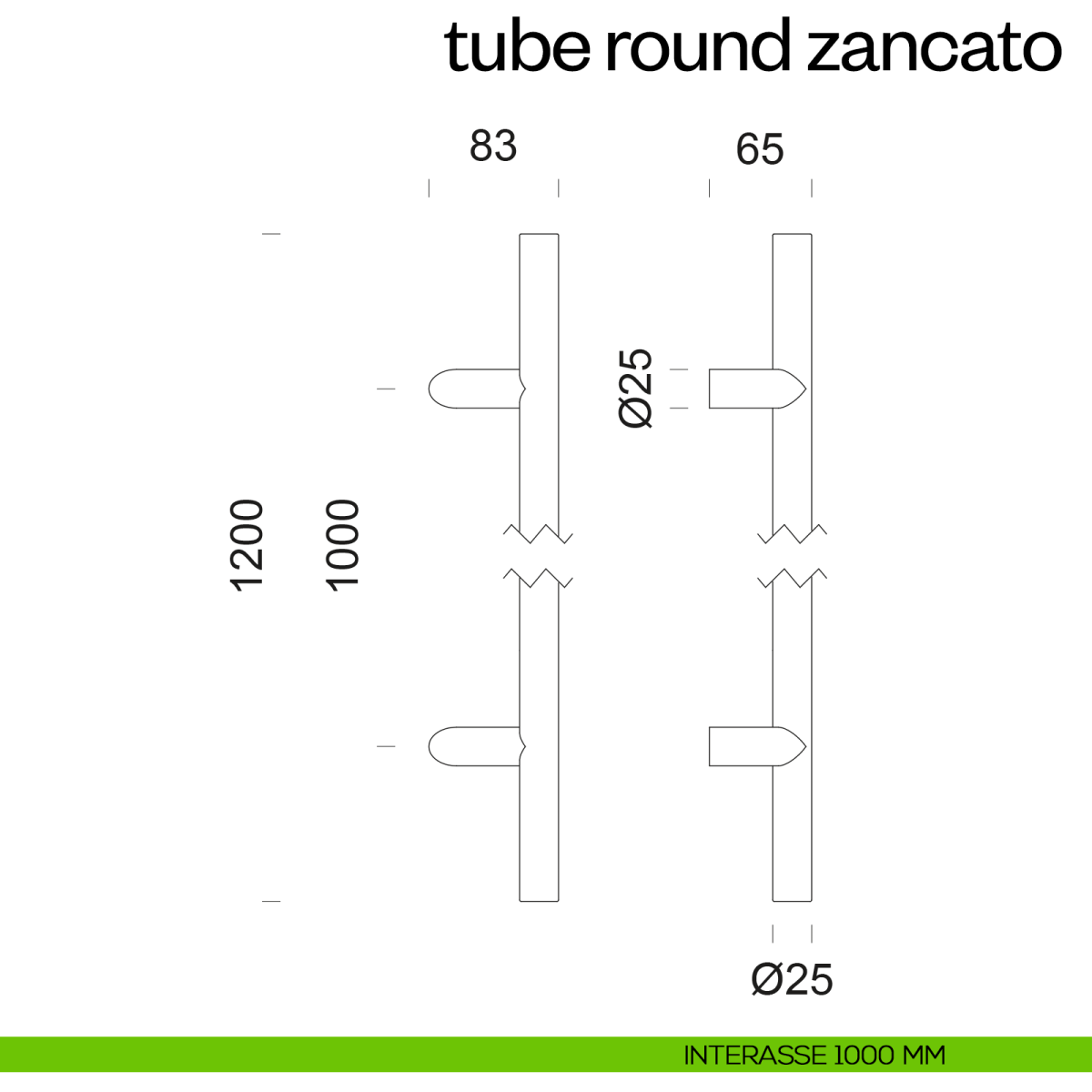Maniglione per porta Tube Round Zancato dnd Handles singolo. Design by dnd Technical Division.