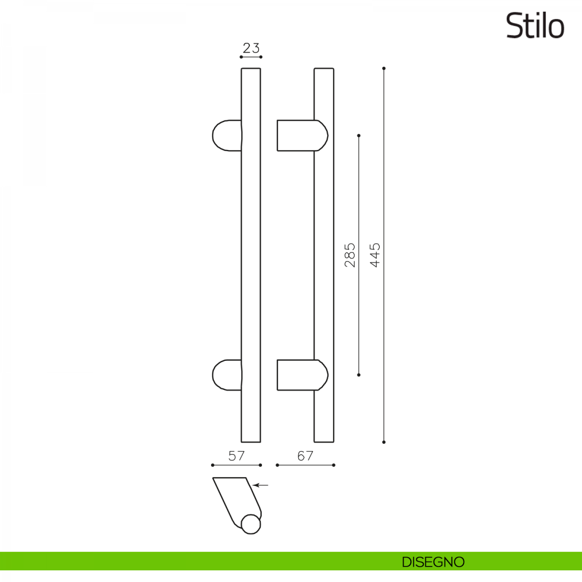 Maniglione per porta Stilo Olivari zancato misura 445 mm senza rosette. Design by Enzo Mari.