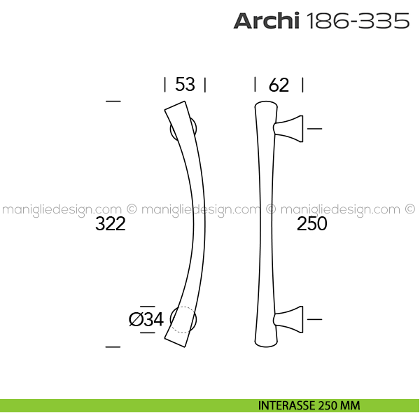 Maniglione per porta 186-335 Archi Reguitti singolo senza rosette. Design by Studio Reguitti.