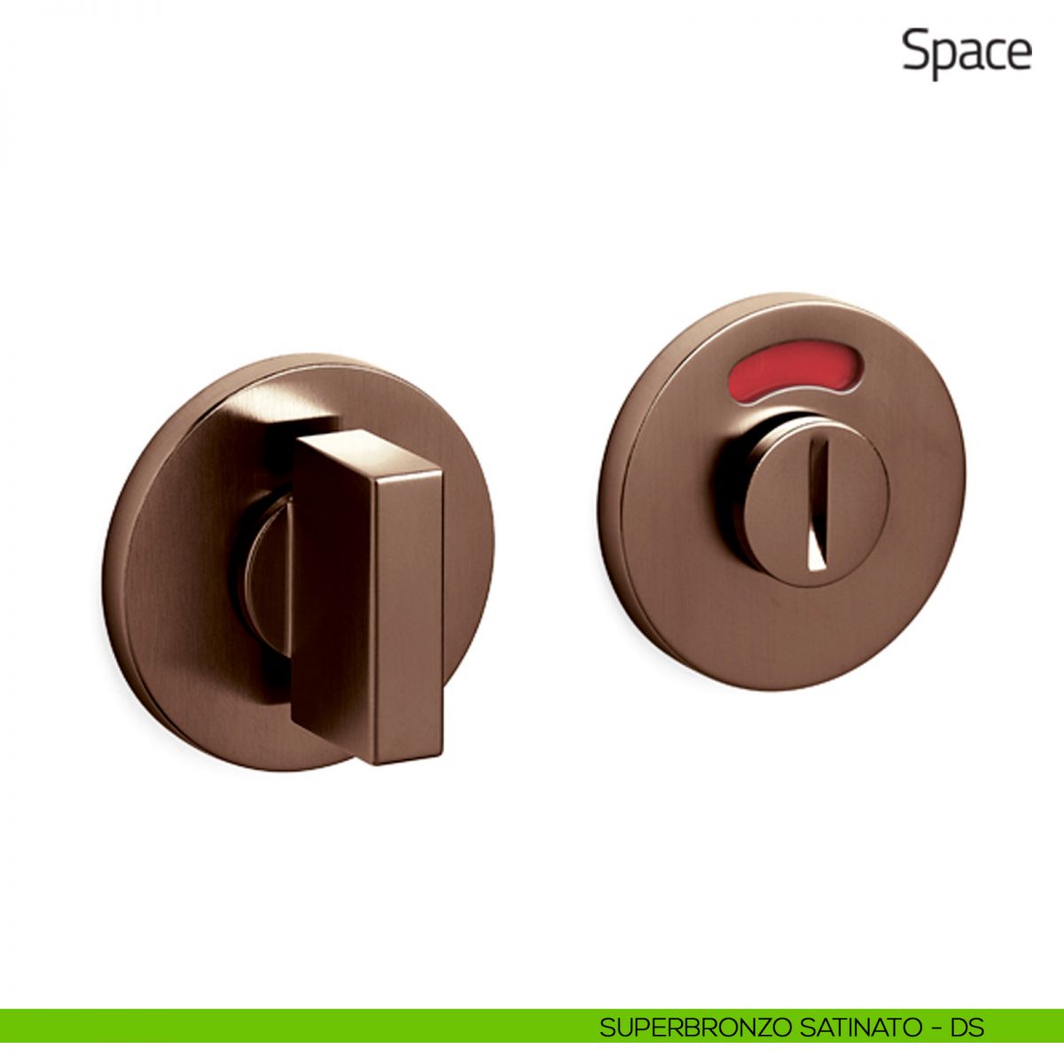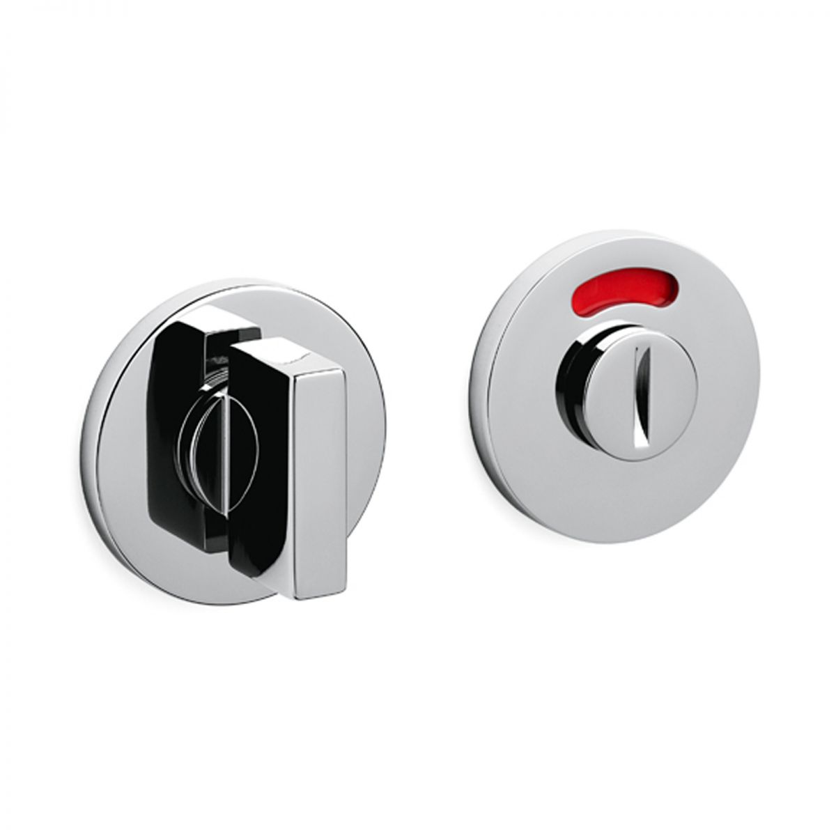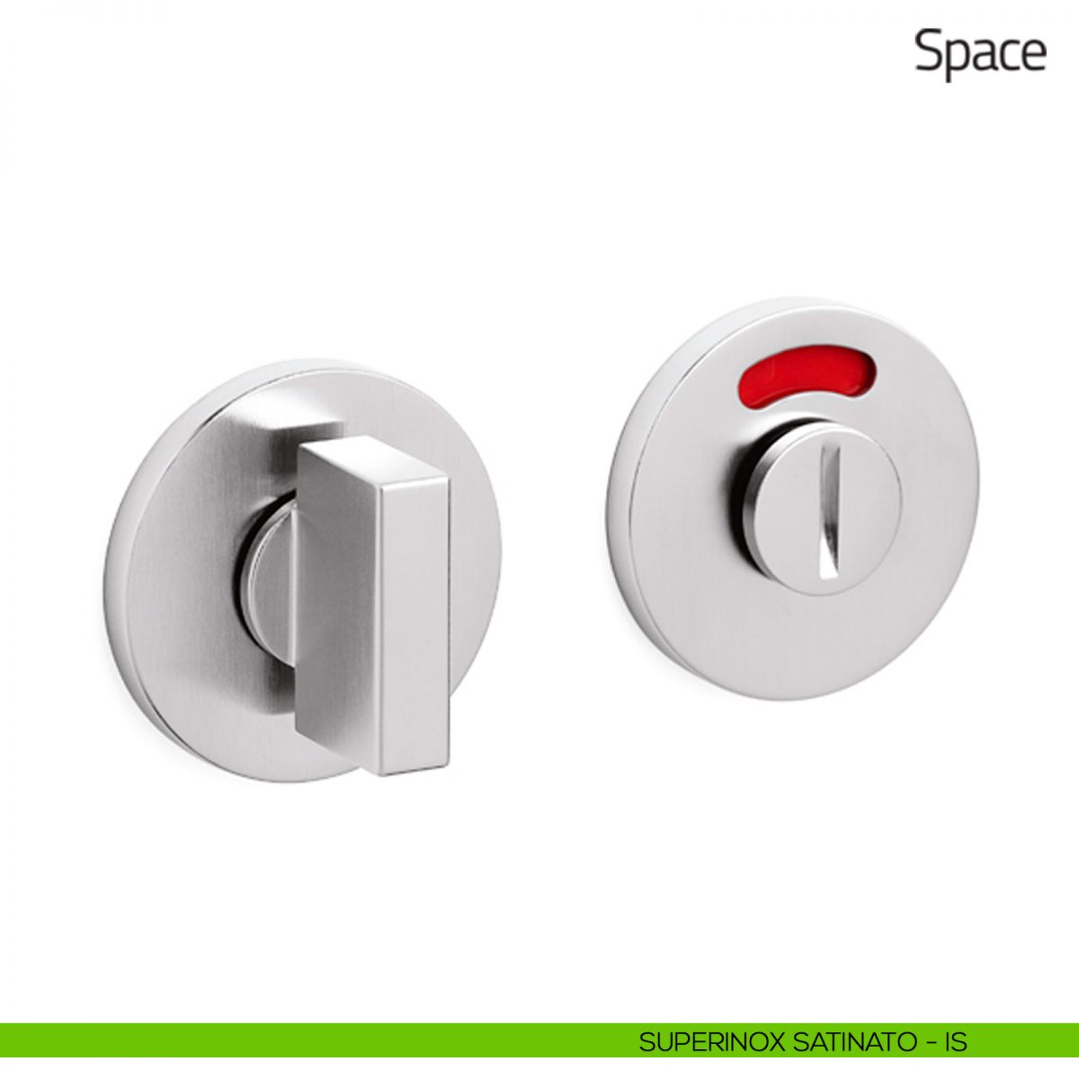 Nottolino per porta Space Olivari con rosetta tonda bassa e segnalatore libero/occupato. Design by Studio Olivari.