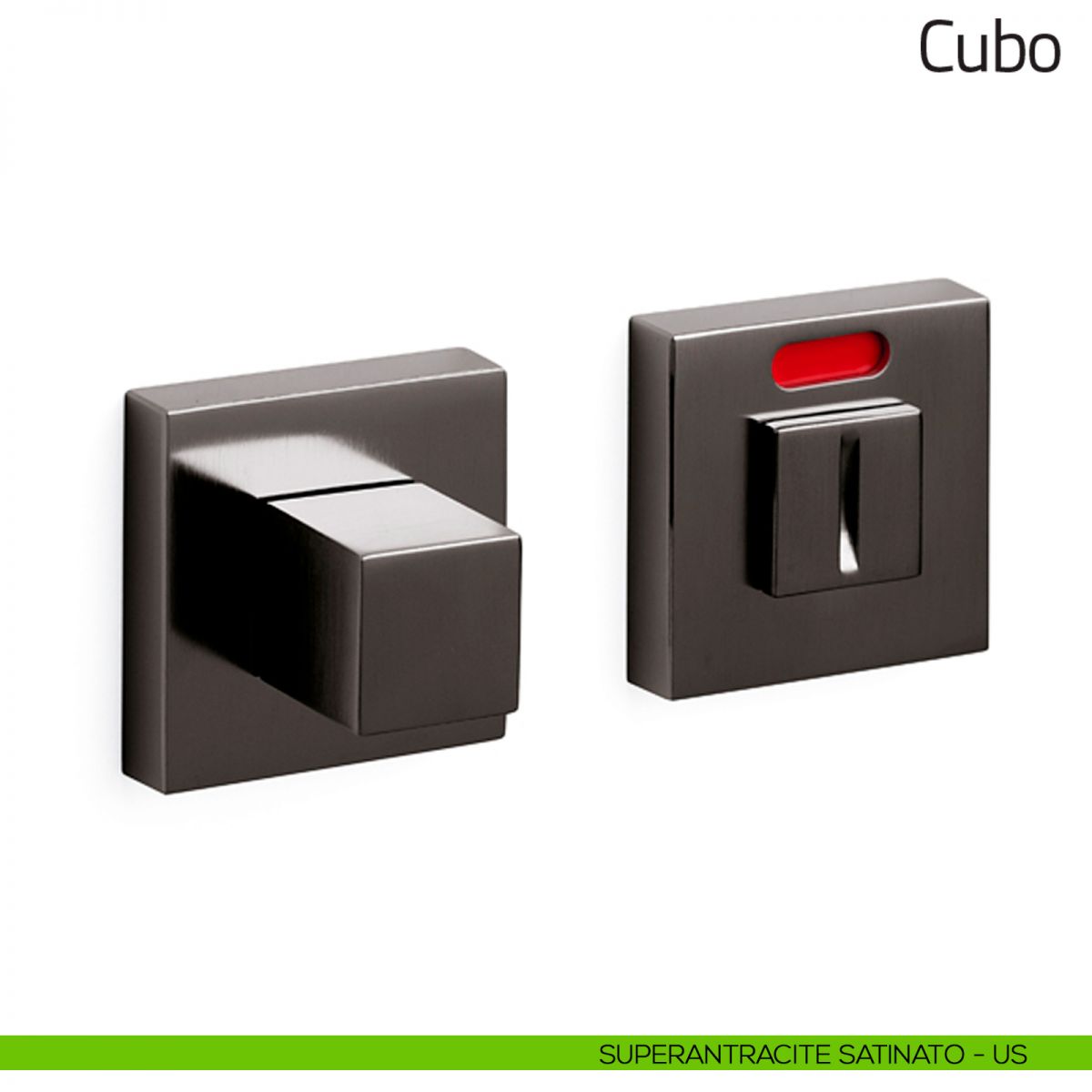 Nottolino per porta Cubo Olivari con rosetta quadrata e segnalatore libero/occupato. Design by Studio Olivari.