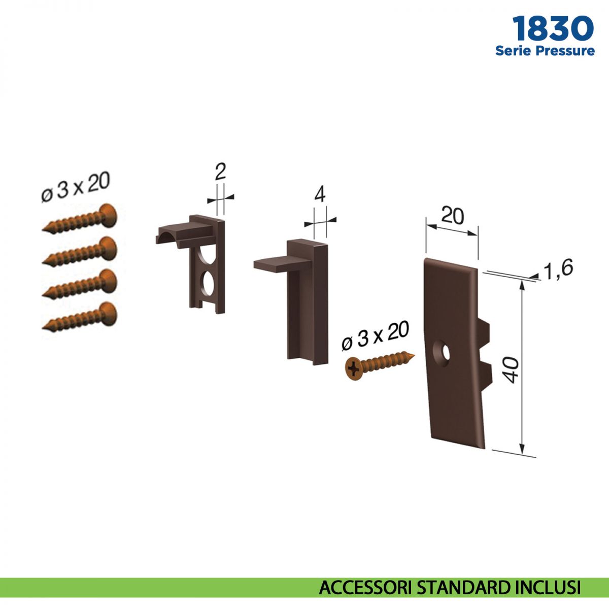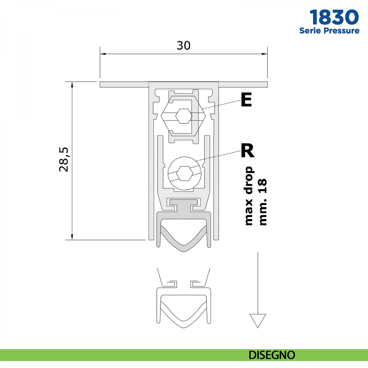 Il catalogo prodotti Comaglio si completa con la Serie 1830 serie Pressure, caratterizzato dal meccanismo Comaglio a doppia registrazione, un dispositivo brevettato finalizzato alla perfetta chiusura della fessura tra porta e pavimento, anche dalla parte opposta del pulsante di spinta. Questa chiusura avviene grazie ad una forte pressione che la guarnizione esercita a pavimento in modo omogeneo su tutta la lunghezza della porta. Tutto ciò risulta decisivo per un'ottimale chiusura in condizioni normali e risulta più evidente in condizioni difficili che, peraltro, si verificano spesso: pavimento concavo, mattonelle sconnesse, ecc. La Serie 1830 di Comaglio è adatta a porte in PVC, blindate, legno e alluminio. E' l'unico che garantisce un isolamento acustico fino a 35 DB, la resistenza al fuoco fino a 30 minuti e 200.000 cicli di funzionamento.