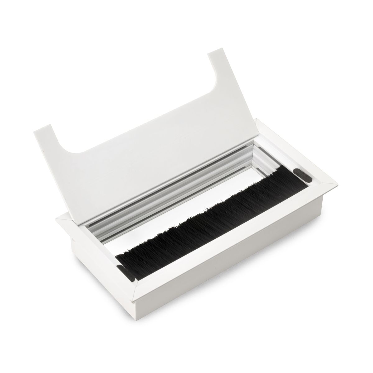 Passacavi rettangolare da integrare in qualsiasi scrivania da ufficio o tavolo, in alluminio. La sua forma rettacongolare permette di passar i cavi di differente misura e spessore e nasconderli in modo facile grazie al suo coperchio reclinabile.