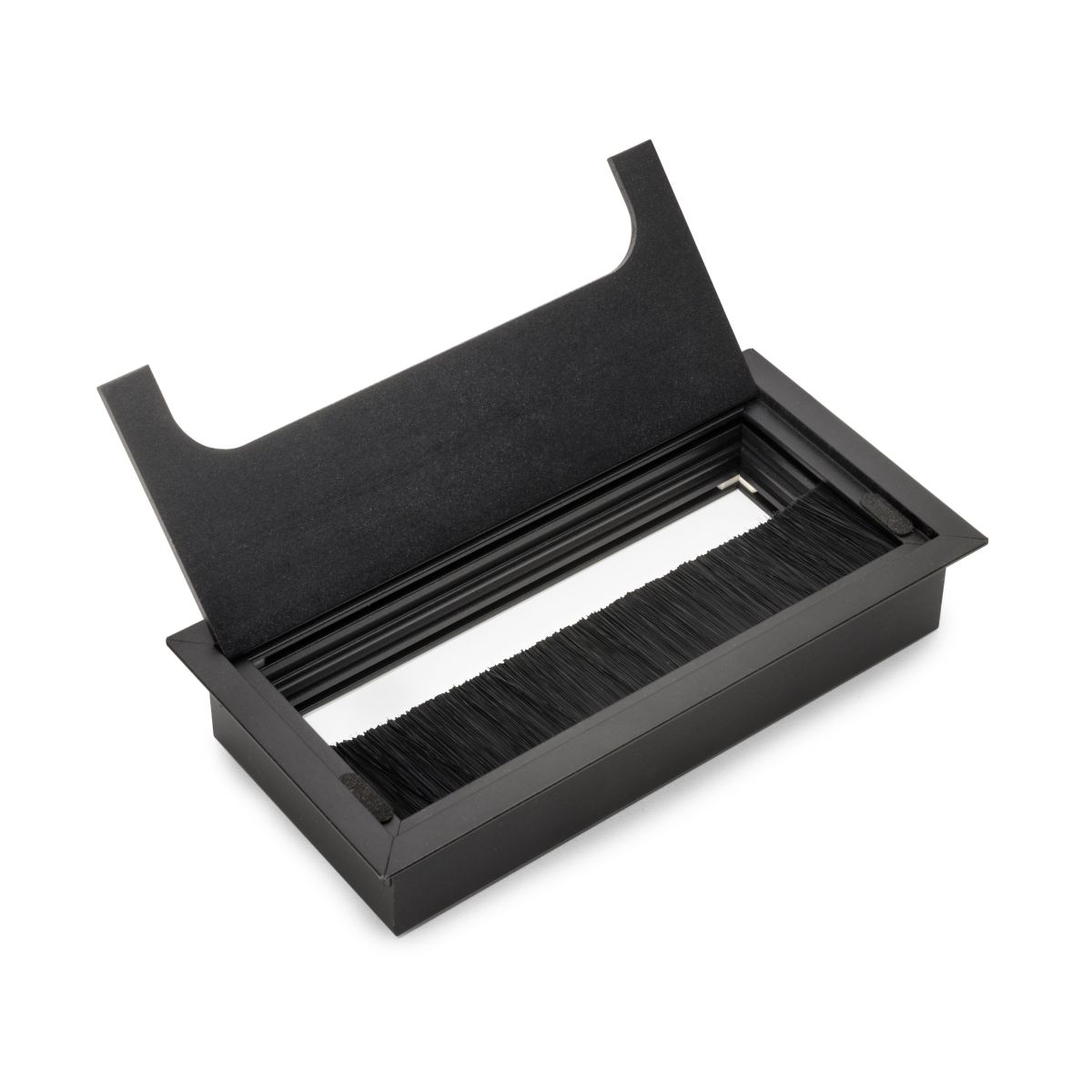Passacavi rettangolare da integrare in qualsiasi scrivania da ufficio o tavolo, in alluminio. La sua forma rettacongolare permette di passar i cavi di differente misura e spessore e nasconderli in modo facile grazie al suo coperchio reclinabile.