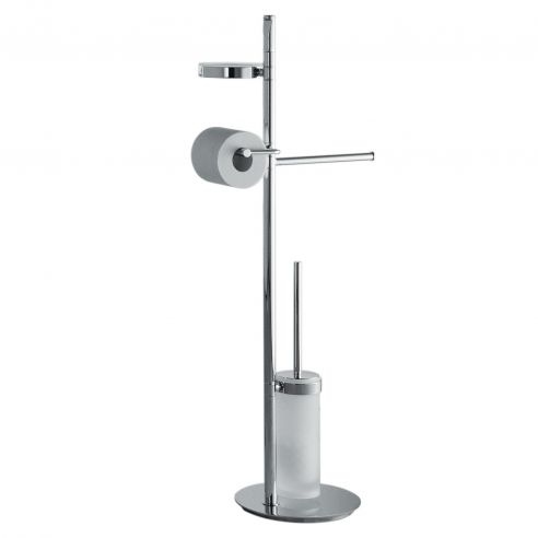 Piantana con spandisapone, porta salvietta, porta rotolo e porta scopino sospeso in vetro acidato Colombo Design Planets finitura cromo.