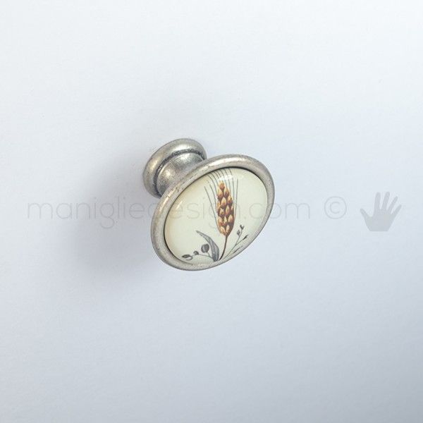Pomello per mobile ceramica avorio con spiga di grano Metal Style finitura argento vecchio.