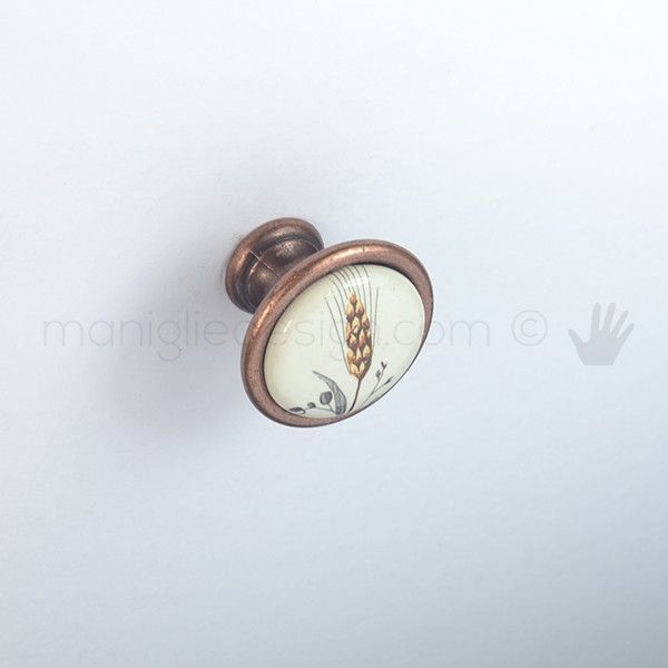 Maniglia per mobile con ceramica avorio con spiga di grano Metal Style finitura rame.