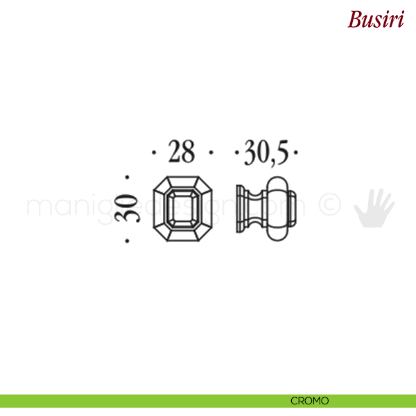 Pomolo per porta Busiri fisso Antologhia con foro interno per barra filettata 10MA, completo di accessori per il fissaggio passante singolo e copridado interno.
