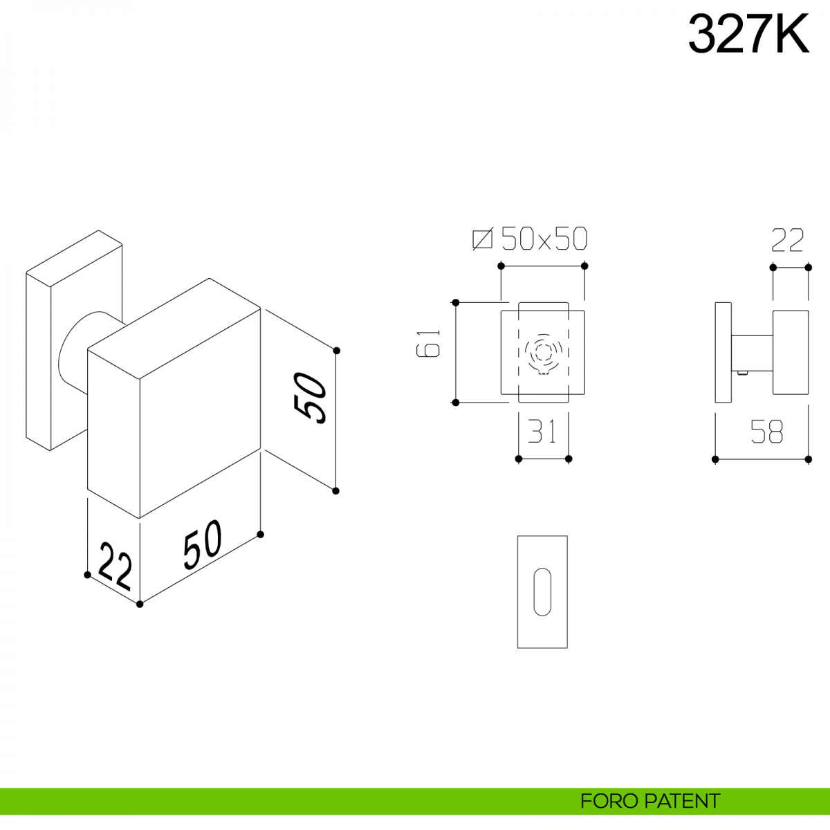 Pomolo fisso quadrato 50x50 mm in acciaio per porta 327K Fimet inox con rosetta rettangolare senza bocchetta.