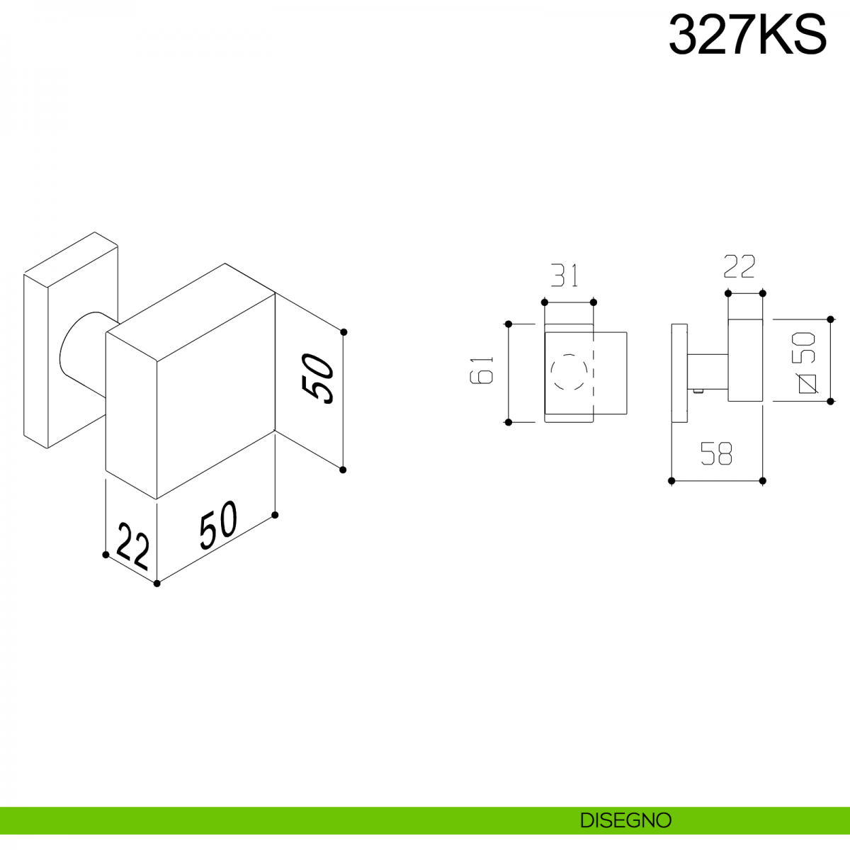 Pomolo fisso zancato quadrato 50x50 mm in acciaio per porta 327KS Fimet inox con rosetta rettangolare senza bocchetta. Design by Fimet Inox.