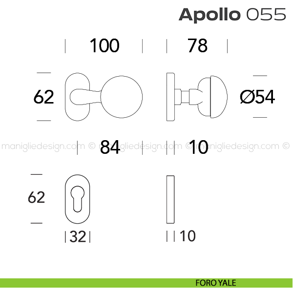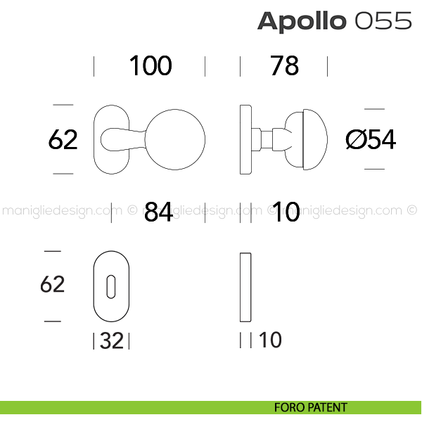 Pomolo per porta girevole 055 Apollo Reguitti con rosetta ovale a pressione completo di bocchette. Design by Studio Reguitti.