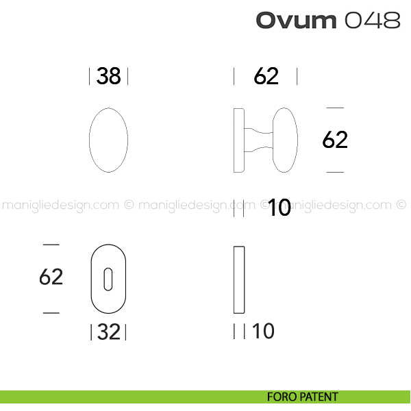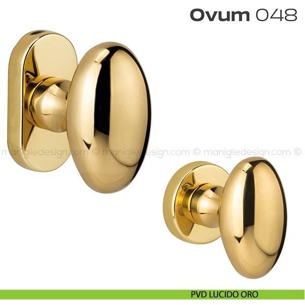 Pomolo ovale per porta girevole 048 Ovum Reguitti con rosetta ovale completo di bocchette. Design by Studio Reguitti.