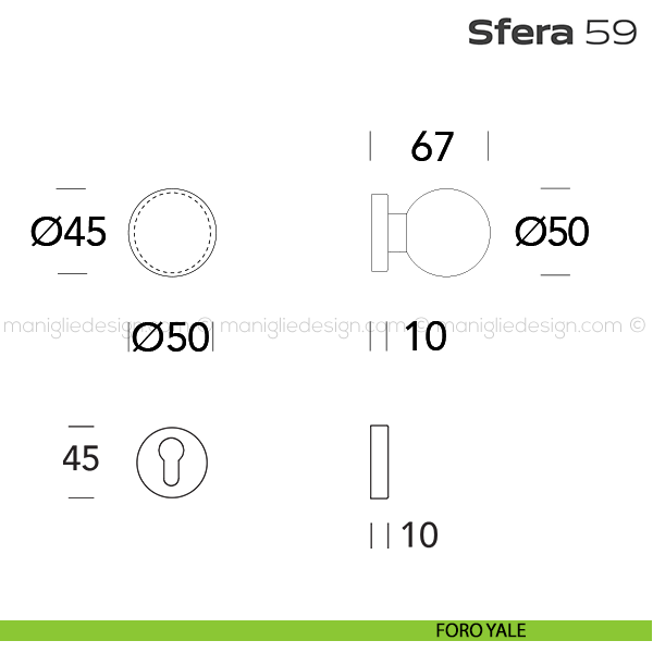 Pomolo girevole diametro 50 mm per porta 59 Sfera Reguitti con rosetta tonda diametro 45 mm pressione completo di bocchette. Design by Studio Reguitti.
