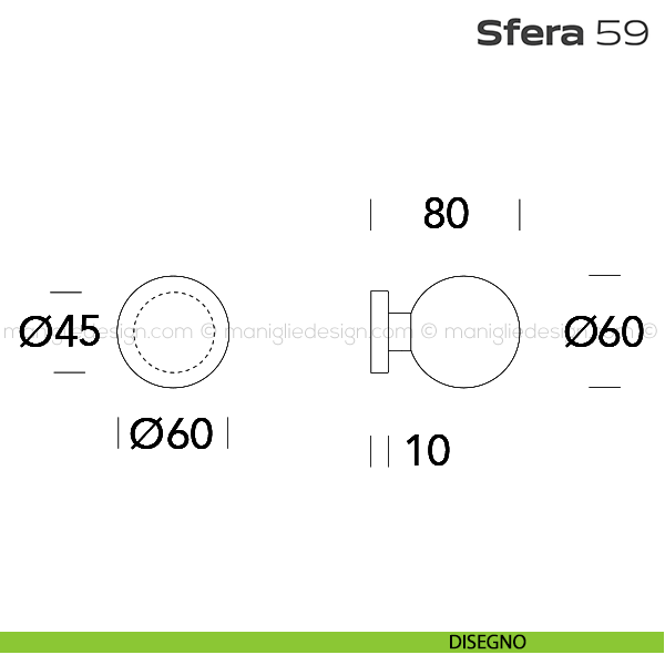 Pomolo fisso diametro 60 mm per porta 59 Sfera Reguitti con rosetta tonda diametro 45 mm a pressione senza bocchette. Design by Studio Reguitti.