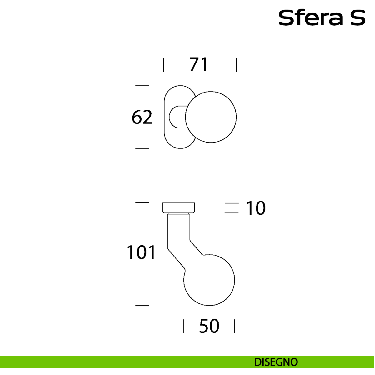 Pomolo fisso zancato in acciaio per porta Sfera S Reguitti inox con rosetta ovale senza bocchetta.