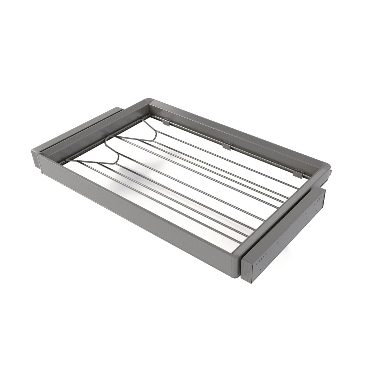 Cornice con guide a chiusura morbida e estrazione totale che supporta fino a 30 kg di peso. Realizzato in plastica e alluminio di alta qualità con una finitura elegante titanio (RAL 7039). Si assembla in modo semplice ed efficiente, basta fissarlo al lato dell'armadio. Progettato per adattarsi a diverse larghezze degli armadi, grazie a una regolazione fino a 13 mm su ciascuna guida e ai distanziatori inclusi.