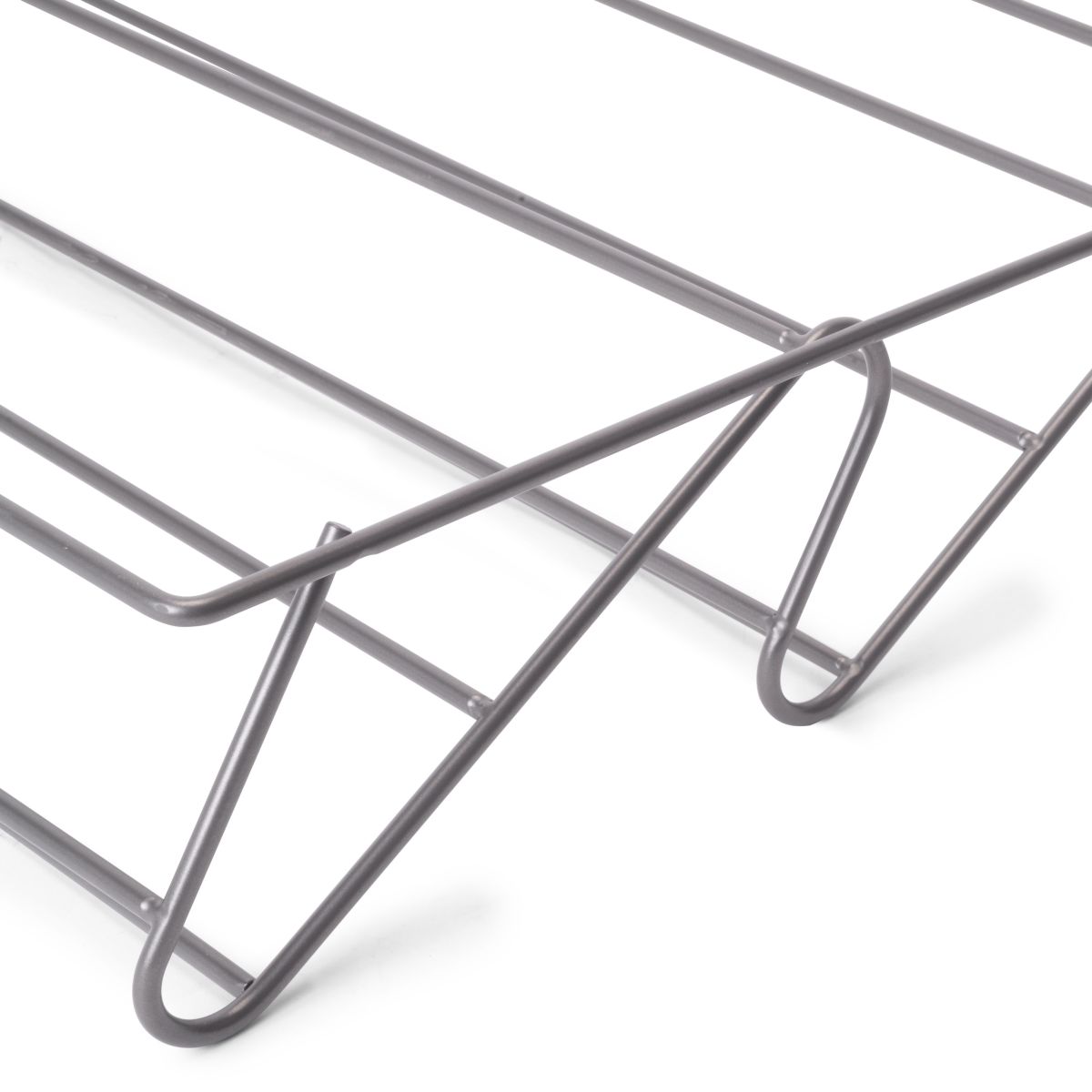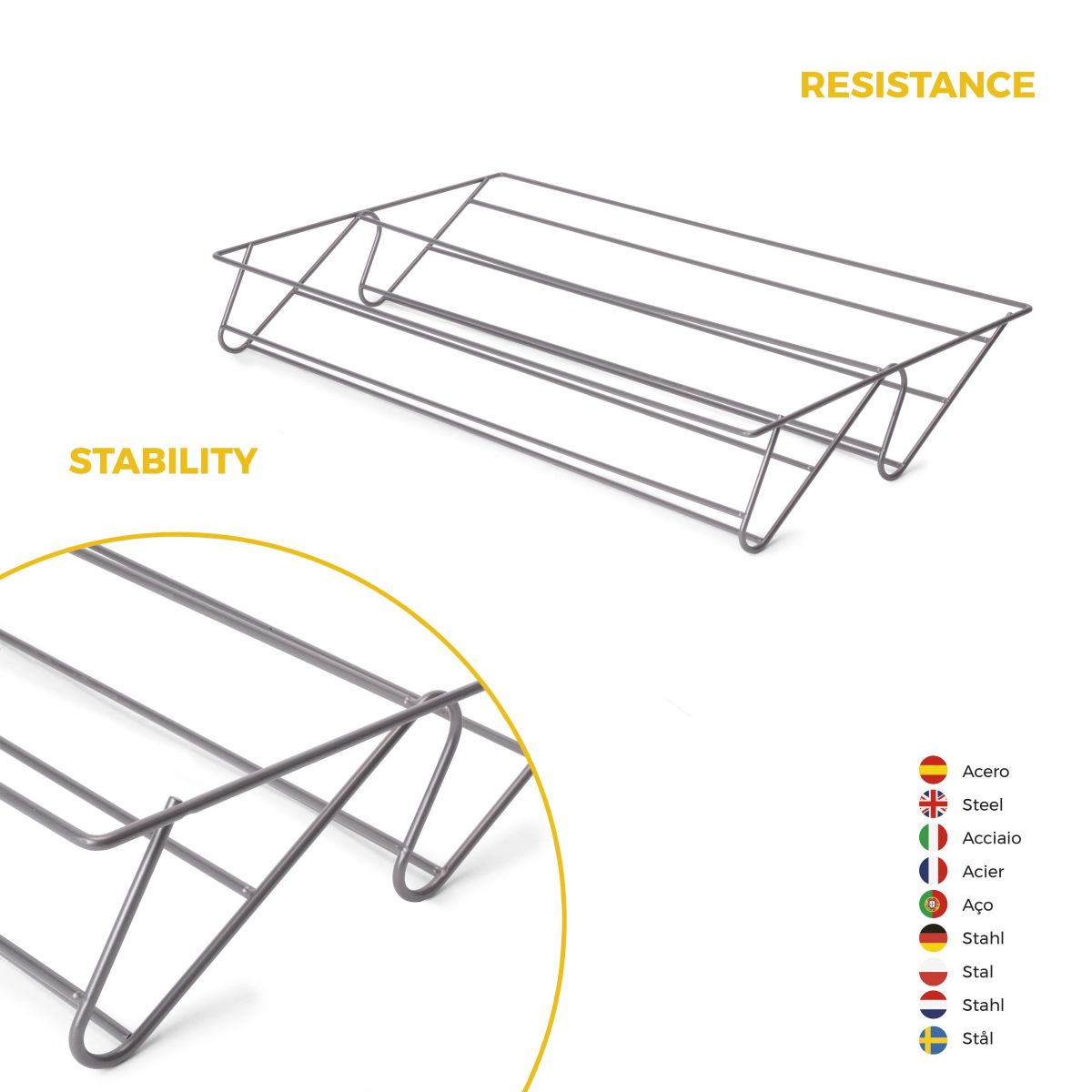 Include 1 cassetto portascarpe in filo metallico, progettato per riporre le scarpe in armadi e cabine armadio. Con una larghezza di 640 mm, profondità di 420 mm e altezza di 140 mm, si adatta a diversi spazi. Realizzato in acciaio con finitura titanio (RAL 7039), offre maggiore resistenza e durata, oltre a un design elegante che si integra con qualsiasi stile di armadio.
